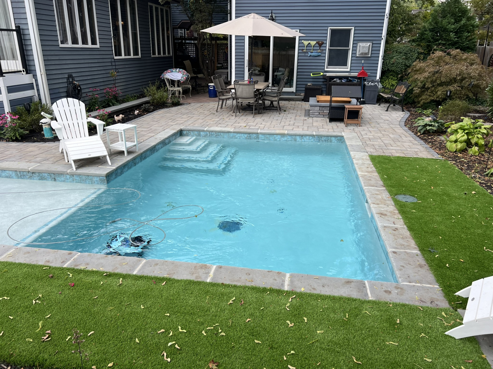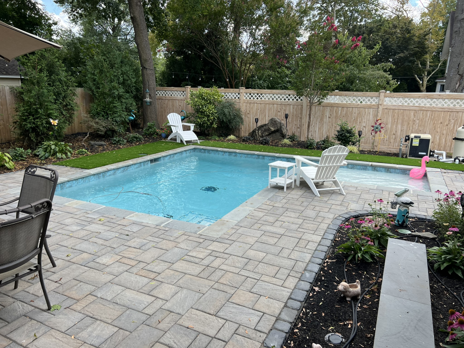 The centerpiece is a beautiful new swimming pool featuring a sun ledge, which provides a shallow area perfect for cooling off or for small children to play safely. For a clean and lasting finish, we used durable Bluestone coping around the pool’s edge, a material known for its slip-resistant qualities. Surrounding the pool, our team installed an interlocking Techo-Bloc paver patio, creating generous space for lounging and dining. We also built retaining walls and steps to work with the yard’s layout, ensuring a seamless flow.