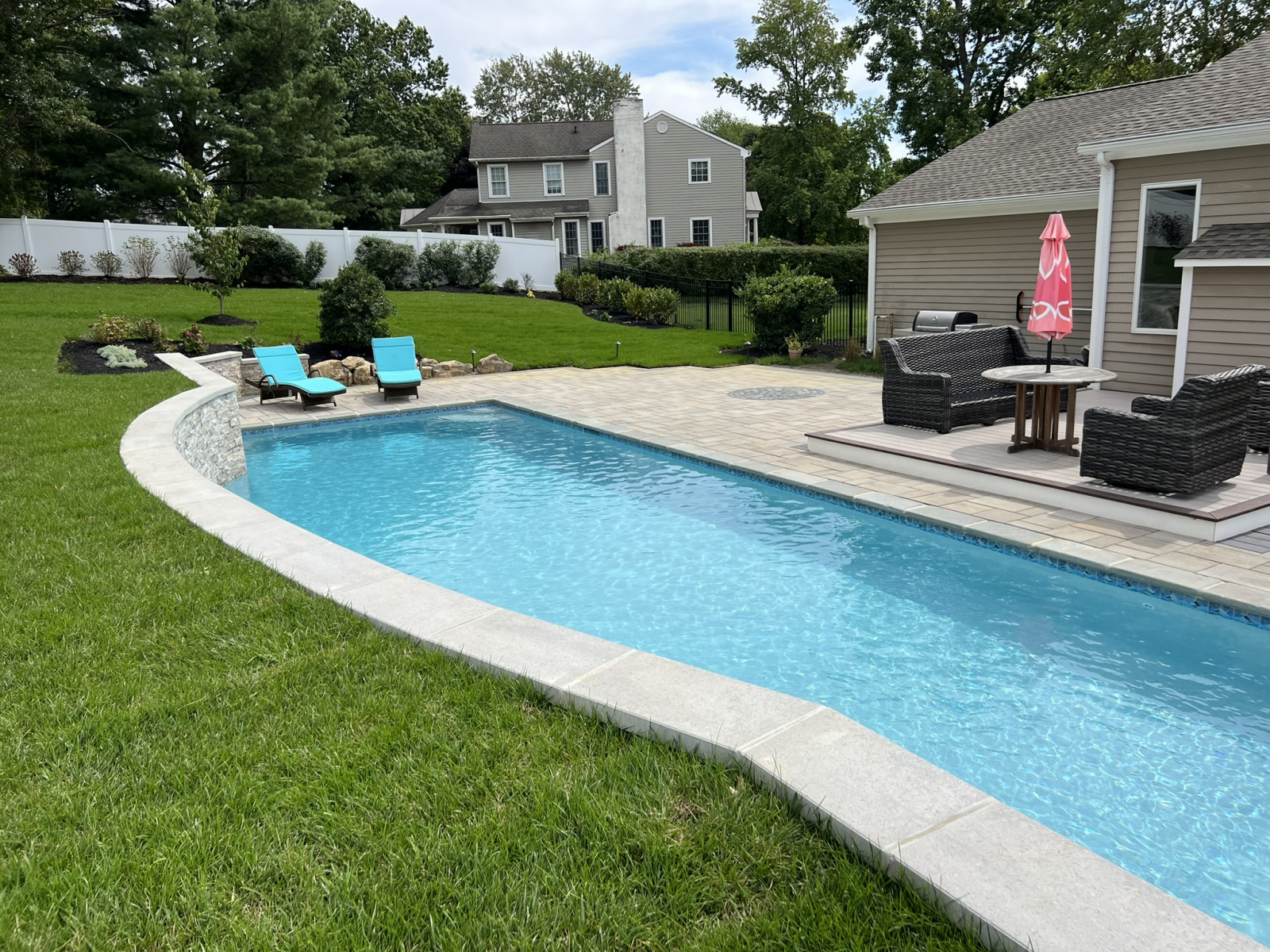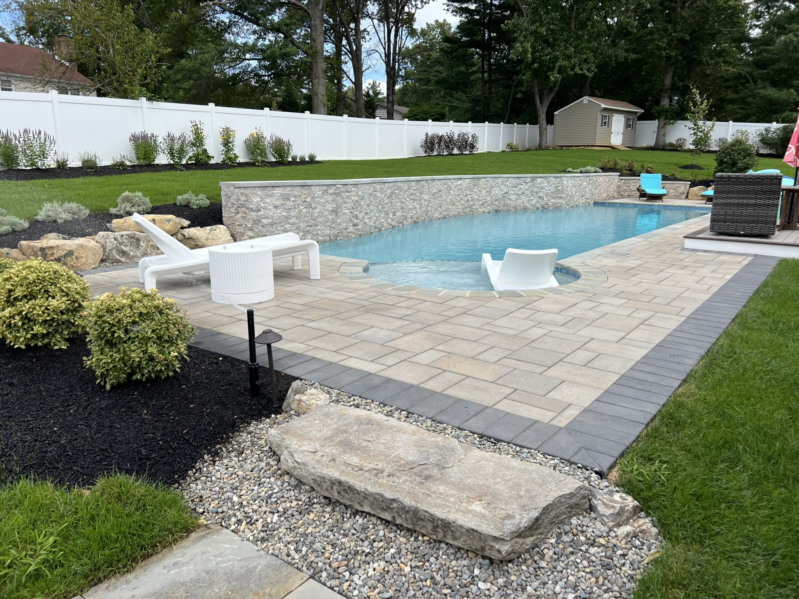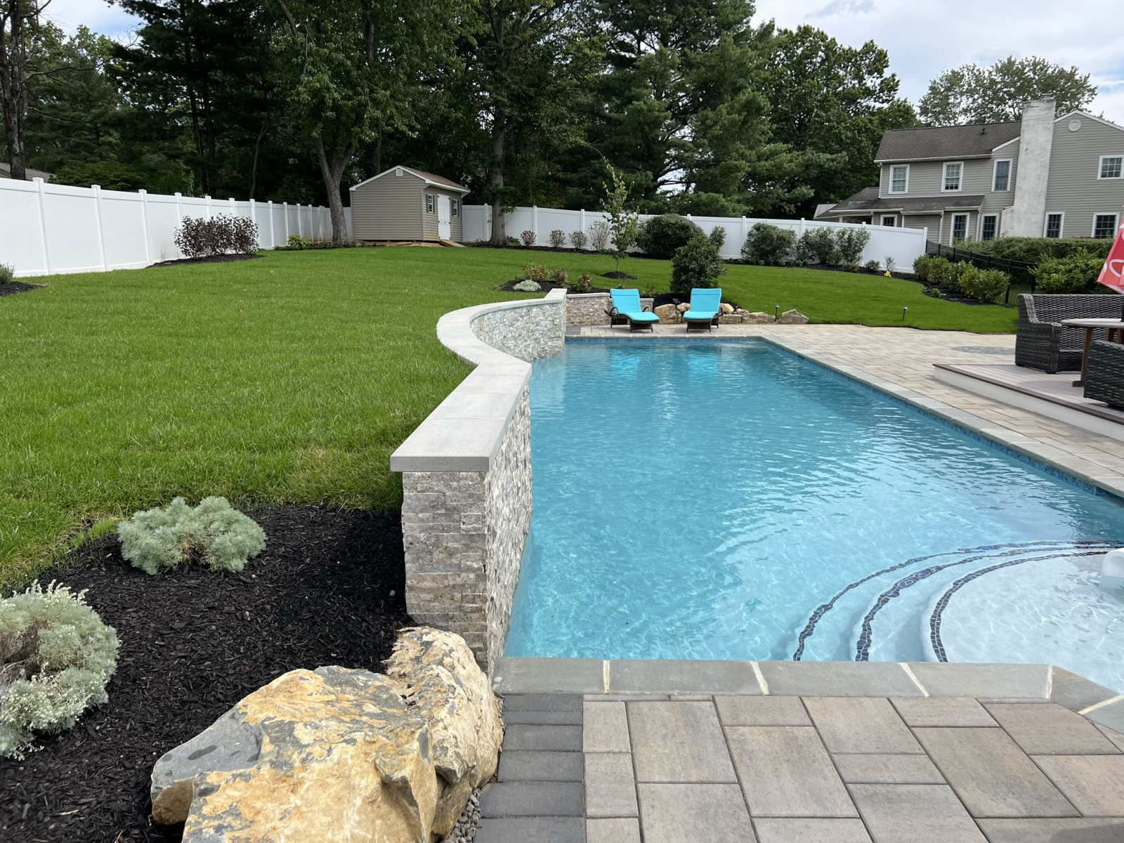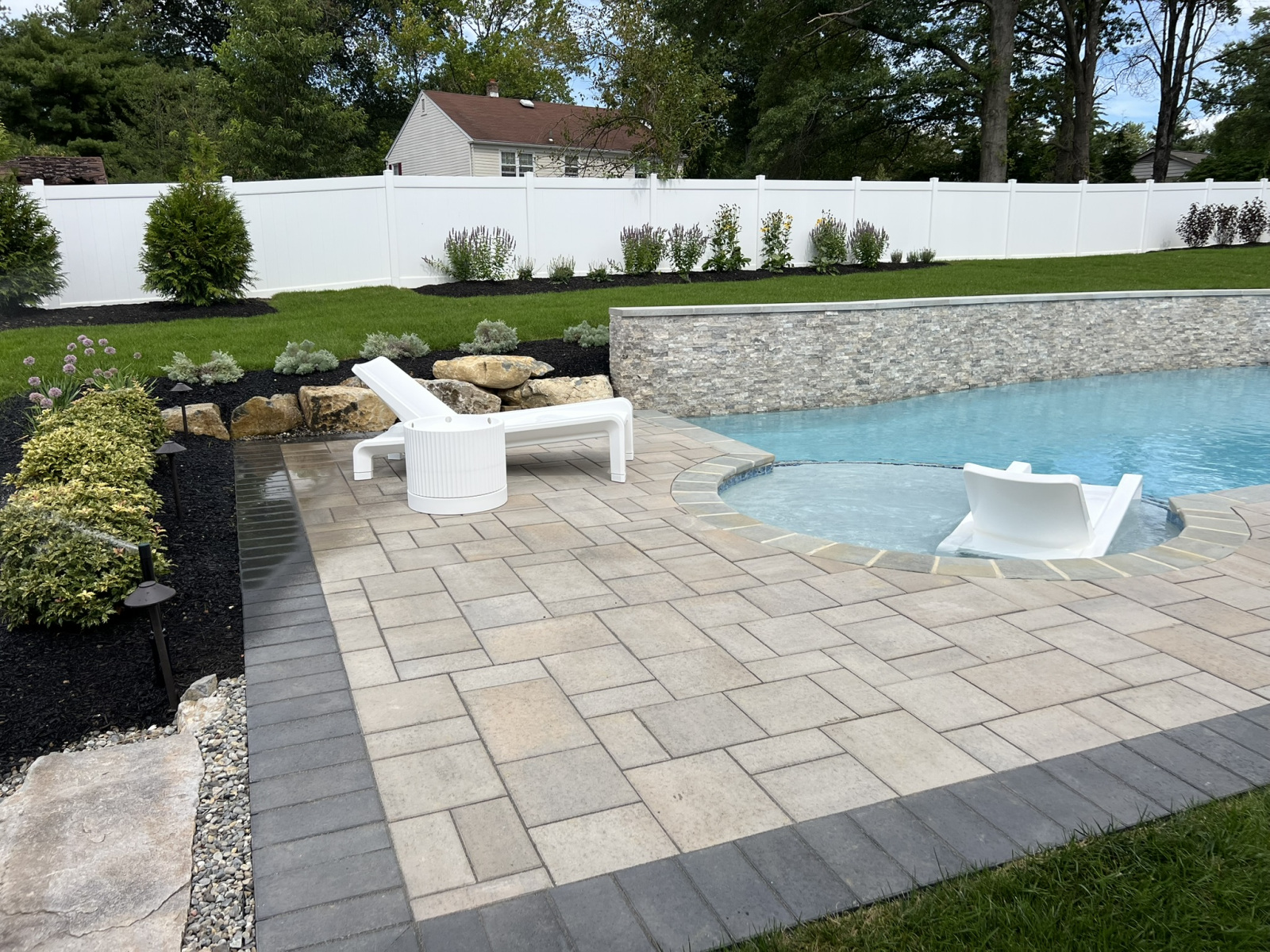 Our latest project shows what is possible for a complete swimming pool, hardscaping & landscaping in Moorestown, NJ, turning a challenging property into a modern family oasis. The yard had a significant grade increase, which we addressed by designing a stunning lap pool with an elevated beam wall. This wall not only retains the slope but also serves as a beautiful focal point. We veneered it with a saw-cut natural travertine stone, a material known for its durability and timeless elegance. Travertine is an excellent choice for pool areas because its porous nature helps it stay cool under the sun and provides a naturally slip-resistant surface, enhancing safety around the water.