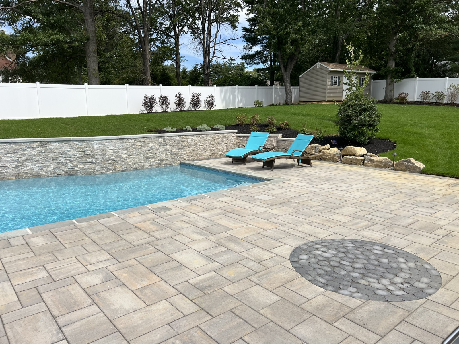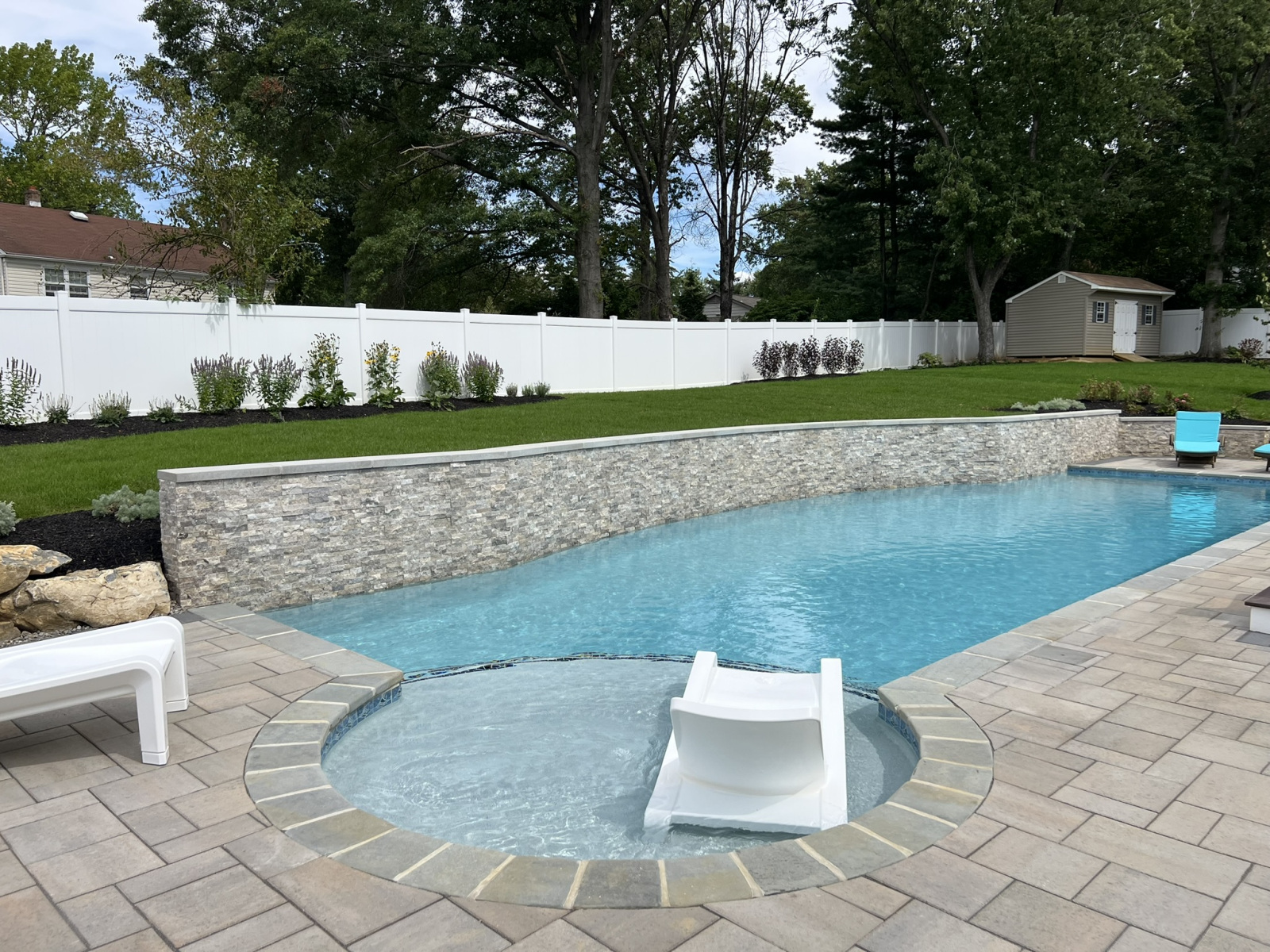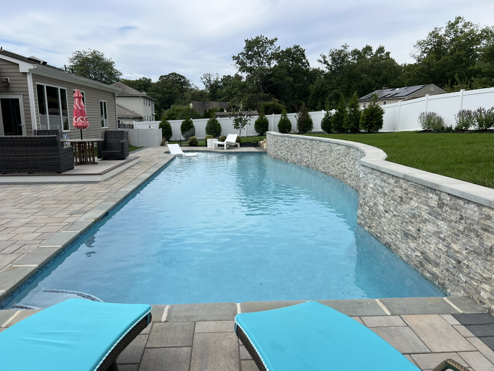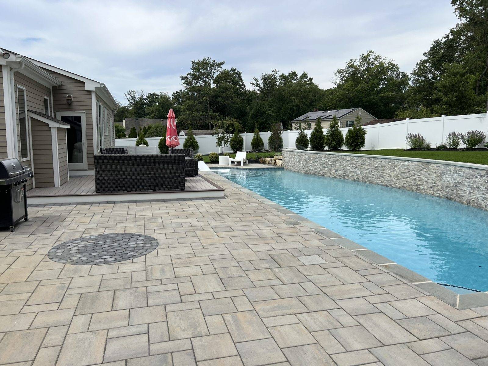 Our latest project shows what is possible for a complete swimming pool, hardscaping & landscaping in Moorestown, NJ, turning a challenging property into a modern family oasis. The yard had a significant grade increase, which we addressed by designing a stunning lap pool with an elevated beam wall. This wall not only retains the slope but also serves as a beautiful focal point. We veneered it with a saw-cut natural travertine stone, a material known for its durability and timeless elegance. Travertine is an excellent choice for pool areas because its porous nature helps it stay cool under the sun and provides a naturally slip-resistant surface, enhancing safety around the water.